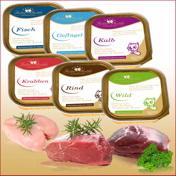 Katzenfutter Nassfutter in Schalen, Dosen und Frischebeutel Gold Edition werden ausschließlich mit Fleisch der höchsten Güte hergestellt und bei schonenender Hitze haltbar gemacht.